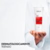 Após o shampoo, aplicar o condicionador nos cabelos úmidos distribuindo uniformemente do comprimento às pontas. Deixar agir por 2 minutos, para potencializar a absorção dos ativos, e enxaguar. Para melhores resultados, usar o protocolo Dercos de 4 passos: